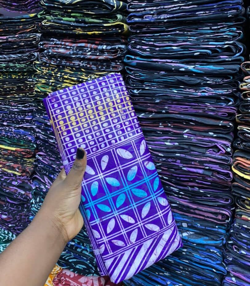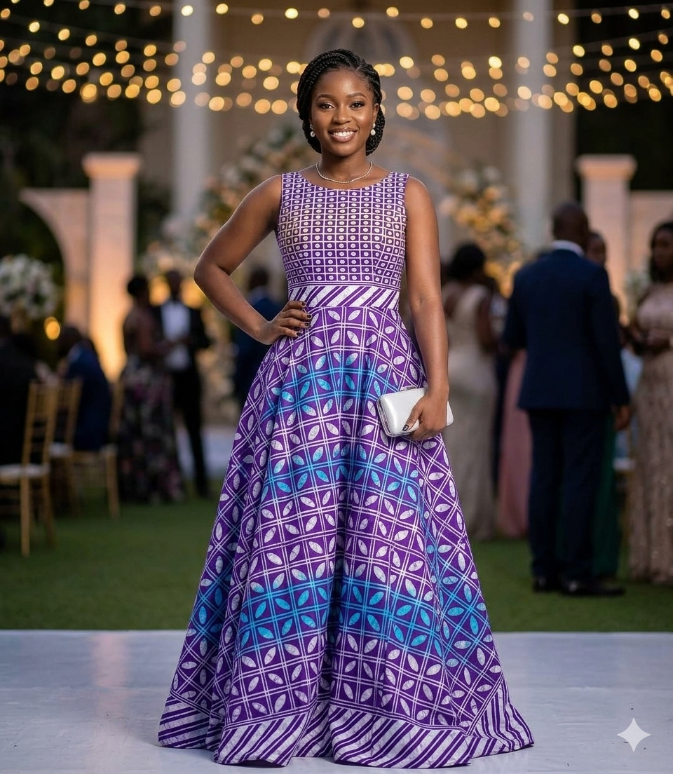 This is a luxurious Adire-style print gown, combining traditional indigo aesthetics with a vibrant modern twist. Known as Adire Polish, this fabric features a captivating hand-dyed pattern in a radiant gradient that seamlessly shifts from deep royal purple at the top and waist to cool turquoise blue through the skirt.